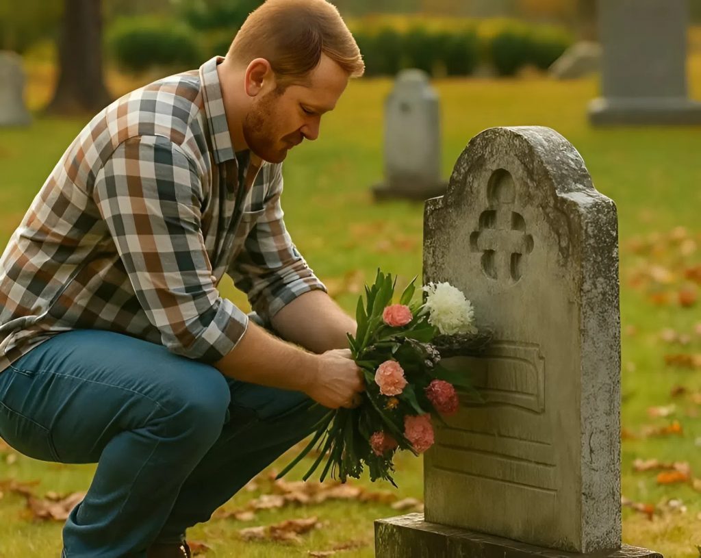 Kun saavuin, hänen haudallaan oli jo tuore kukkakimppu. Ei mitä tahansa kukkia — täsmälleen samoja, joita minä aina toin. Kauniisti ja huolellisesti aseteltuja.
