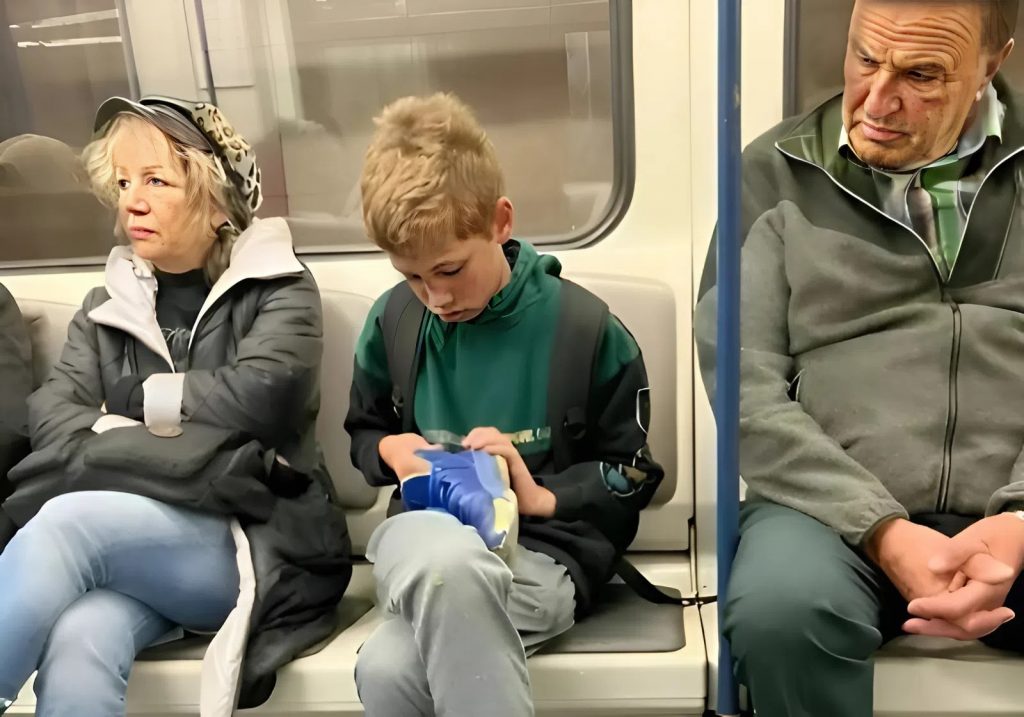 Eräällä asemalla ovet avautuivat tavanomaisella metallisella sihahduksella, ja vaunuun astui noin kymmenvuotias poika. Hän näytti siltä kuin olisi juuri karannut toisesta todellisuudesta: hiukset pörrössä, shortseissa tahroja, toisessa kädessä yksi lenkkari ja toinen… kadoksissa. Mutta eniten silmään pisti se, että hän oli paljain jaloin. Toisessa jalassa oli vain ohut raidallinen sukka, joka juuri ja juuri peitti varpaat.