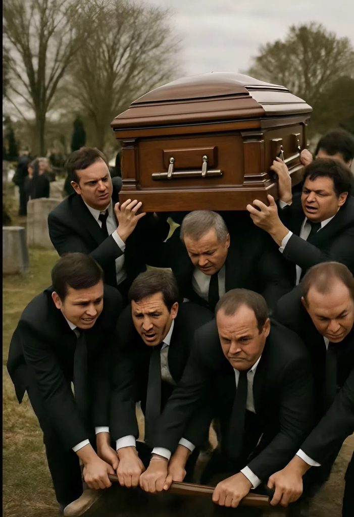 Arkku oli upea — harvinaista tummaa puuta, kiillotettu peilimäisen kirkkaaksi, raskain messinkisin kahvoin. Kun tuli aika kantaa se haudalle, astui esiin kahdeksan miestä — sukulaisia, ystäviä ja kaksi hautaustoimiston työntekijää.
