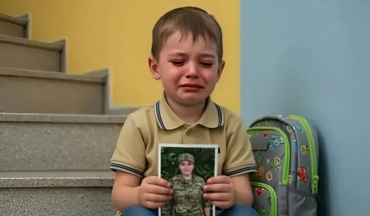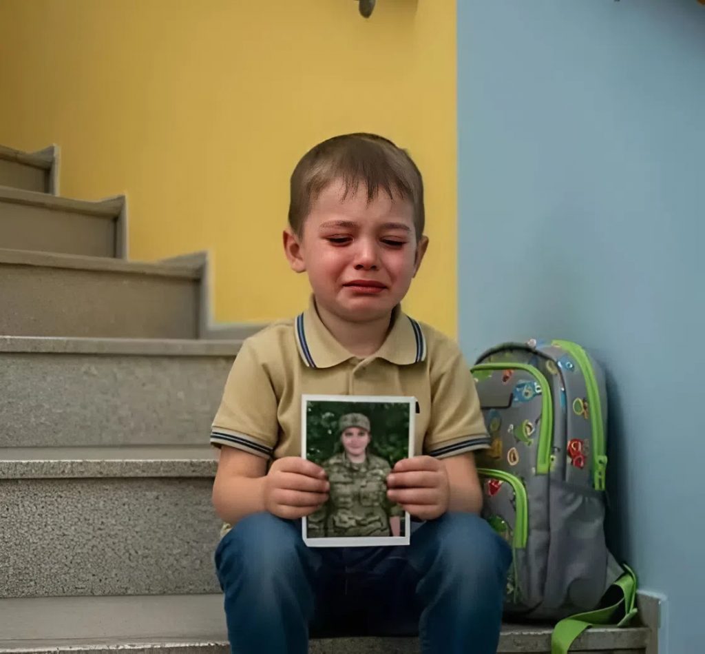 На фотографії — маленький хлопчик, що сидить на шкільних сходах. Його очі червоні від сліз, руки тремтять, а в долонях він міцно тримає фото чоловіка у військовій формі. Він ще не вміє висловити словами весь свій біль, але його сльози промовляють голосніше, ніж будь-який крик. Його дитинство зупинилося в ту мить, коли тато пішов захищати країну… і перестав повертатися додому щовечора, як колись.